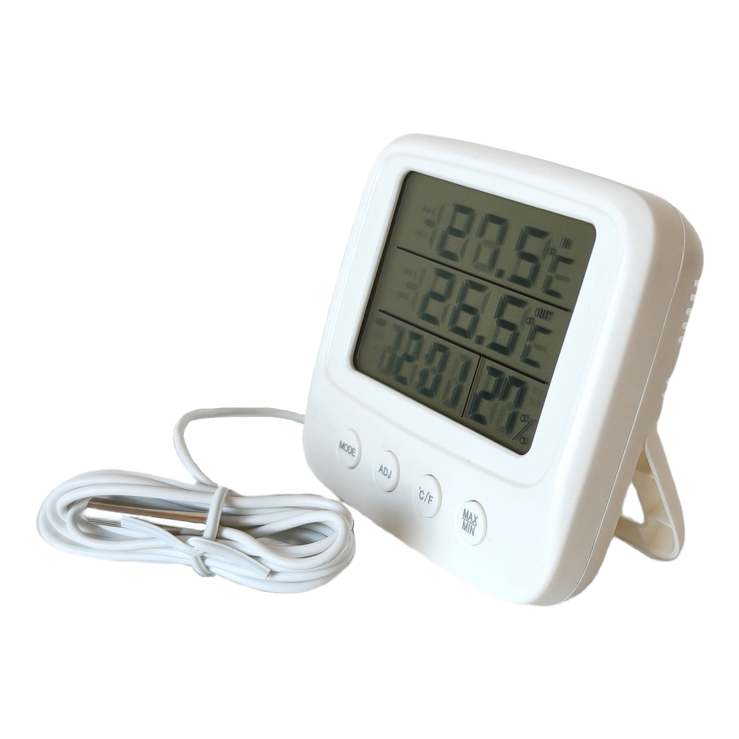 Humidity display: Sa karagdagan ng temperatura, maaari din itong ipakita ng porsyento ng humid, na tumutulong sa iyo na mas maayos na maayos ang iyong kapaligiran ng buhay. 24-oras na display: Sa karagdagan ng temperatura at humiga, maaari rin itong ipakita ang kasalukuyang oras, at ito’y maging komportable para sa araw-araw na buhay mo. Panlabas na sensor: may mga panlabas na sensor, maaari itong basahin nang tiyak ang temperatura at humiga ng mga natatanging lokasyon, upang maiwasan ang deviation ng pagbabasa mula sa isang lokasyon.
